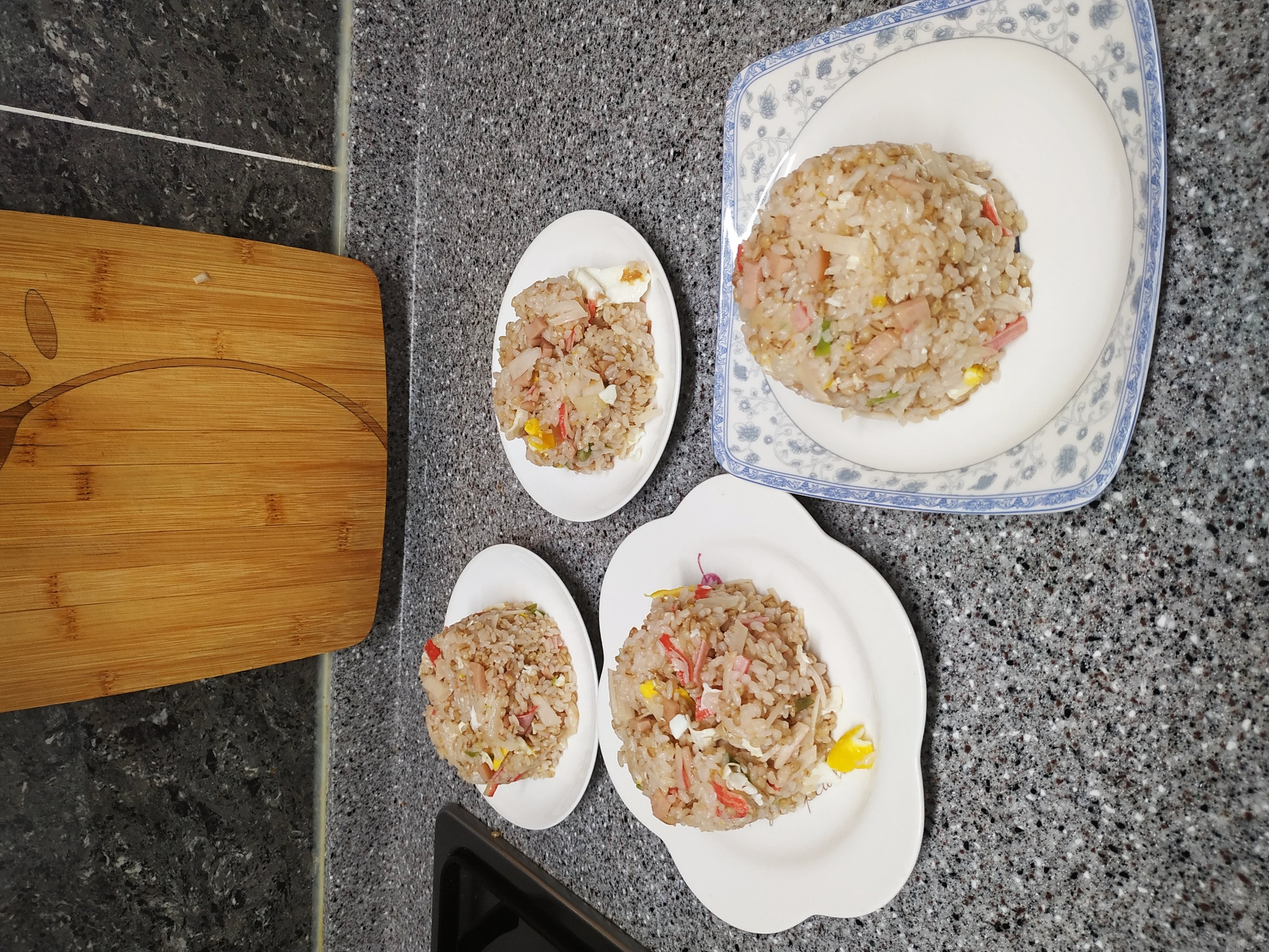 재료 : 밥(4공기 분량), 계란(3개), 대파(1 뿌리), 게맛살(3개), 햄(먹고 싶은 만큼), 양파(1/2개)
